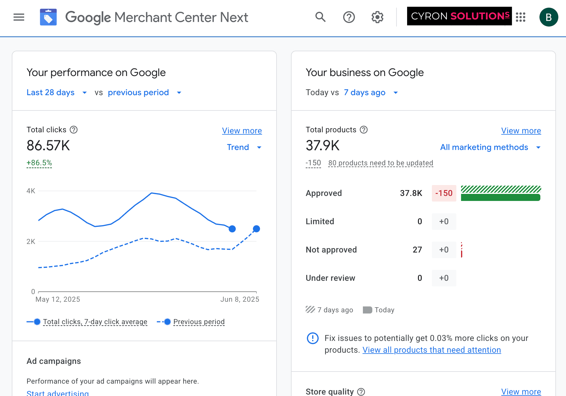 "Cyron Solutions got our Merchant Center live within days fully compliant and stable. No suspensions, no stress. Their guidance was crystal clear, and support was always one step ahead."